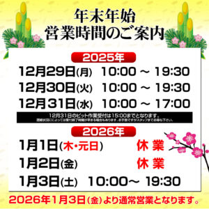 年末年始営業時間のお知らせ 年末年始の当店の営業スケジュールをご案内致します。 12月31日は10:00~17:00までの営業ピット作業受付は15:00までとさせて頂きます。 1月1日、2日は休業とさせて頂き...
